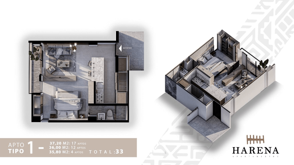 Harena combina 59 apartamentos de 23 m² a 52 m² con un mall comercial en la planta baja para crear un ecosistema residencial y de servicios único en Quimbaya, Quindío. Su diseño inteligente, la oferta de locales gastronómicos y de conveniencia, y la cercanía a los principales atractivos del Eje Cafetero convierten a Harena en la opción preferida de quienes buscan vivir, invertir o rentar por temporadas cortas con alta rentabilidad.